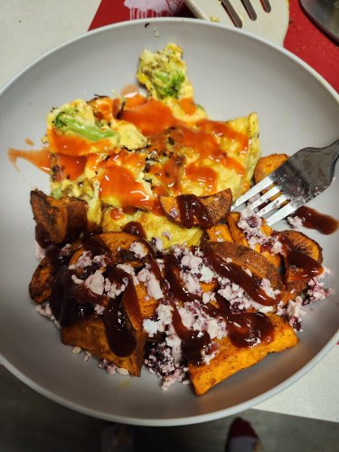 On the left made, I roasted sweet potatoes with turmeric, garlic powder, ginger, onion powder, black pepper, and salt. They are topped with cranberry goat cheese and sweet and spicy Sweet Baby Rays. I paired it with a scrambled egg with broccoli and Franks hot sauce.