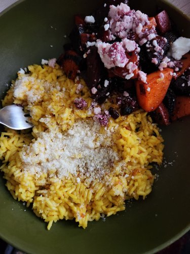 On the right, I have Vigo’s yellow rice with parmesan. I also roasted beets and sweet potatoes with dark maple syrup and red wine vinegar reduction. Once again topped with cranberry cream cheese.