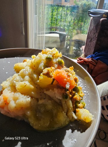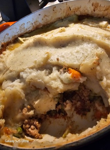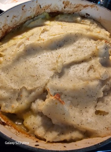 Add in mashed potatoes on top of the veggies and meat,