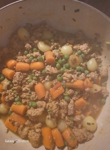 Add in Peas, Rosemary, and Ground Turkey, cook until brown.